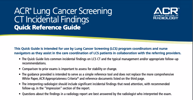Download ACR Quick Reference GuideKathleen: How do we keep the continuity in patient care when there are multiple tests and physicians involved in the process? Dr. Dyer:The fragmentation in healthcare is certainly something that doesn't help. I think that's why at least our centralized program is so helpful because we don't have lots and lots of people in the mix, we have two navigators and six advanced practice providers. And between those folks, we can manage, and we can communicate. And just keeping those lines of communication open and in a way tight just I think can make a huge difference. Because you're right. I mean, things can get missed, dropped, fall through the cracks. And that's what we don't want. Bringing somebody in for screening, all of us are pretty much on board. Yeah. We know we're looking for lung nodules and nodules that might be cancer. But there are going to be these other things that need to be addressed.Kathleen: Looking forward, what technologies are you currently using and what do you see being used in the future? Dr. Dyer:We do use our electronic health record, we're able to query the record for smoking, either current or former. And we hope that nearly every electronic healthcare record will make sure in the years to come, if not currently, that they have some sort of information there that is easy to query and that is accurate. It's really hard to keep the smoking information accurate. Because some patients stop and start, and it's tricky, so we can't rely 100% on the EHR, but it is at least a start.What we're hoping to see in the next five years let's say, that every electronic health record provider, vendor out there will provide some sort of an alert to the primary care provider and indicate, based on what information we have here, your patient may be eligible for lung cancer screening. At least that alerts them and highlights the need to talk to the patient about getting screened.And then also in the primary care offices, if the patient meets initially with a medical assistant, a medical assistant could probably do a little interview and drill down further on smoking and find out if they do meet the screening eligibility criteria.I think technology has the potential to help us, I really do but it's not the complete answer. I do think technology and a navigator or program coordinator are the keys to at least getting a foothold. And then as programs expand, you add people. We used to have one navigator and now, it looks like we're going to end up with two and a half because we have so many patients. We're still not anywhere near where we want to be and in Colorado, I'm embarrassed to say our uptake on a state level for lung cancer screening is only 3.3%. Nationally, it's somewhere around 5%. Some states are up around 10, 12%. When I say uptake, I mean by that the eligible percent of eligible patients that are getting screened.There are other ways that you can also use technology. For instance, many states have all-payer claims databases where a query can be done. And I'm part of our Cancer Coalition in Colorado, and our Lung Cancer Task Force did a query of our all-payer claims database and we were able to find out where in our state lung cancer screening is occurring by the billing. Then we know where it's being performed, where it's being billed. And these databases include Medicare, and Medicaid, and commercial insurance.We could very quickly tell from that data the parts of Colorado that aren't billing anything for lung cancer screening and now we know that's where we need to start targeting. And again, that's the underserved, the rural areas and it is using technology in a way to confirm what we knew, but that's valuable to know and act upon. Kathleen: Again, looking to the future, when do you think Medicare will come out with the guidelines you mentioned previously?Dr. Dyer:We're hoping by the first of the year. We are expecting any day now that they’ll release their draft recommendations, they told us they would have something in November. Then there will be a 30-day comment period, and then they will have to review the comments again. I'm hoping by the first of the year. It would make it a lot easier if everybody had the same guidelines for eligibility. I work very closely with a lot of program navigators in Colorado, and they get it, and they just have to explain to patients - you have Medicare, right now if you're 50, we can't screen you, let me put you on a list to call back in the future. With the updated guidelines we’re hoping that's going to change.Kathleen: If a patient doesn't meet the screening criteria, does that mean their insurance doesn't pay for the scan?Dr. Dyer: Yes, and most lung cancer screening programs will have a self-pay option. The strict criteria are age and smoking history. But there is another way of looking at eligible patients which is through kind of elaborate risk prediction models and there are a number of them. There is one that we use here on all our patients, it's called the Brock model. Basically, it looks at a lot of other things besides smoking history and age. It looks at exposures, and radon, and family history and it can calculate a percent risk for lung cancer. And in the calculation, if the patient has higher than a 1.5% risk, then we will screen on a self-paid basis, even if they don't have that magic number of pack years. We don't scan young people, but basically, we do if they have any of these other exposures that increase their risk. Our approach is to evaluate each individual patient. We do have the self-pay option, and some of our docs will refer patients here because they're aware of it and they know this patient has some sort of a unique situation.One thing that's unique in Colorado is we have a lot of mining and people are exposed to radiation in uranium mining. Also, the work that they do, not just the uranium exposure, but other mining, can increase their risk of lung cancer as well. Here i